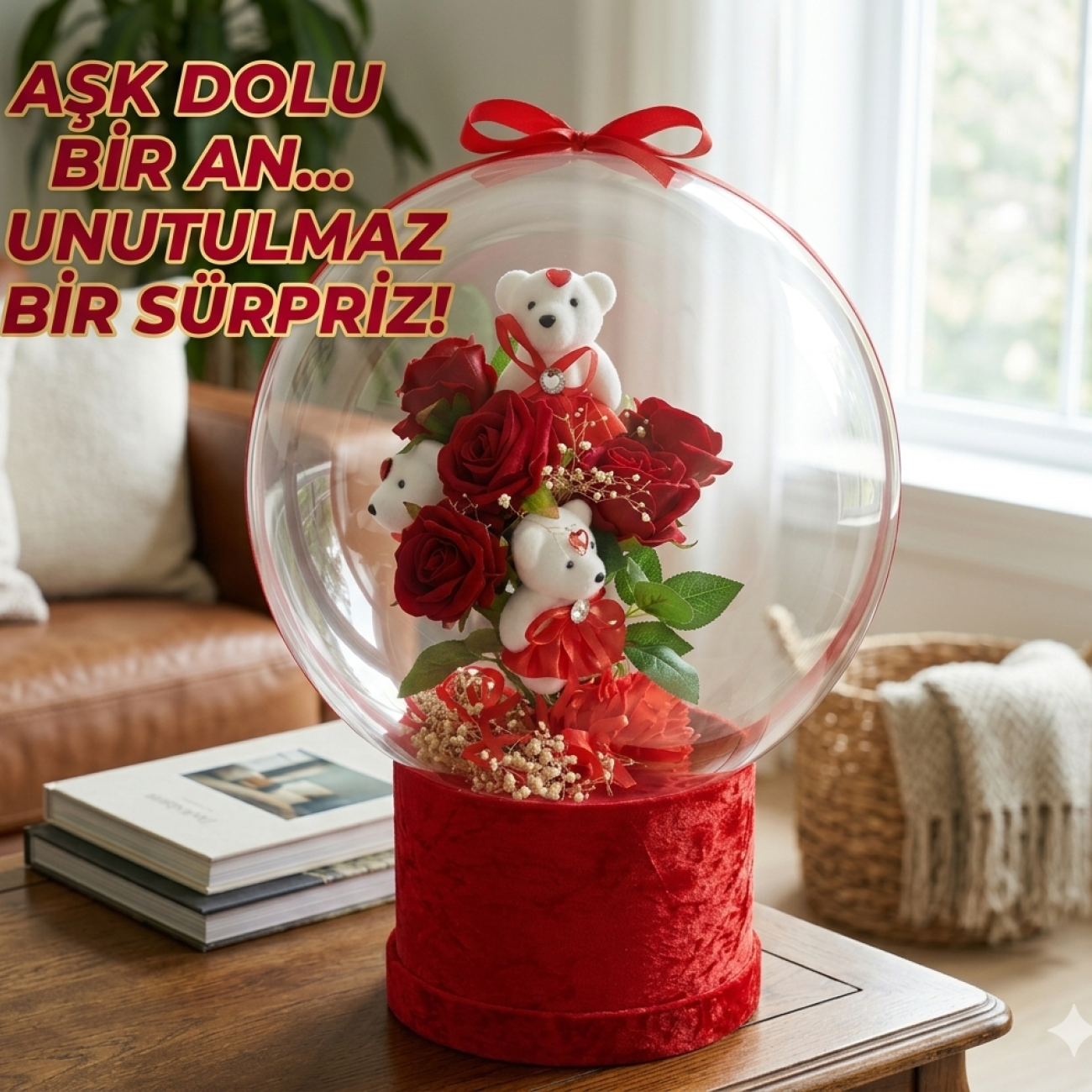 Sevdikleriniz için unutulmaz bir sürpriz mi arıyorsunuz? Kadife kutuda ayıcıklı ve kırmızı güllü balon aranjmanı, estetik tasarımıyla en özel anlarınıza eşlik ediyor. Lüks kadife dokulu kutusu, içerisinde yer alan sevimli ayıcığı ve özenle seçilmiş kırmızı gülleriyle bu hediyelik balon kutusu, romantik bir atmosfer yaratmak için idealdir. Şeffaf balonun içindeki bu eşsiz kompozisyon, dekoratif şıklığı ve kalıcılığı bir arada sunar. Sevgiliye hediye olarak veya özel günlerinizde masanızın en değerli parçası olacak bu dekoratif balonlu gül kutusu, modern sunumuyla göz doldurur. Sevdiklerinizin yüzünde gülümseme yaratacak bu premium tasarım, evinizin veya ofisinizin havasını anında değiştirir. Kalite ve şıklığın buluştuğu bu özel ayıcıklı gül buketi aranjmanı, sevdiklerinize verdiğiniz değeri göstermenin en zarif yoludur. Siparişinizi hemen oluşturun, bu benzersiz hediye ile kalpleri kazanın.