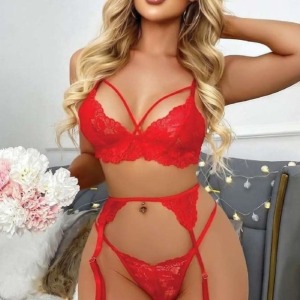 Kırmızı Dantel Sütyen, Külot ve Jartiyer Takımı