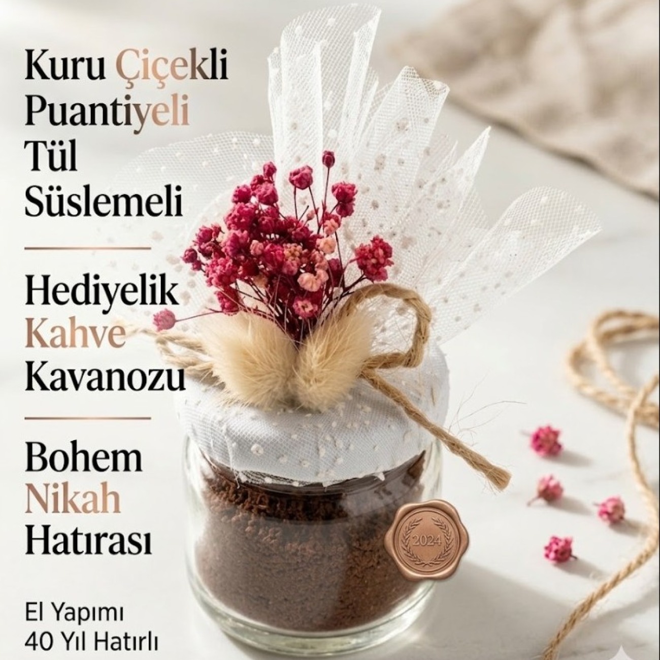 En mutlu günlerinizi ölümsüzleştirecek, zarafetiyle göz dolduran hediyelik kahve kavanozu ile misafirlerinize unutulmaz bir sürpriz yapın. Bu özel tasarım, beyaz puantiyeli tül detayları ve canlı pembe tondaki kuru cipso çiçeklerin eşsiz uyumuyla hazırlanmıştır. Doğal hasır ip ve soft dokulu detaylarla zenginleştirilen ürünümüz, bohem ve modern estetiği bir araya getiriyor.