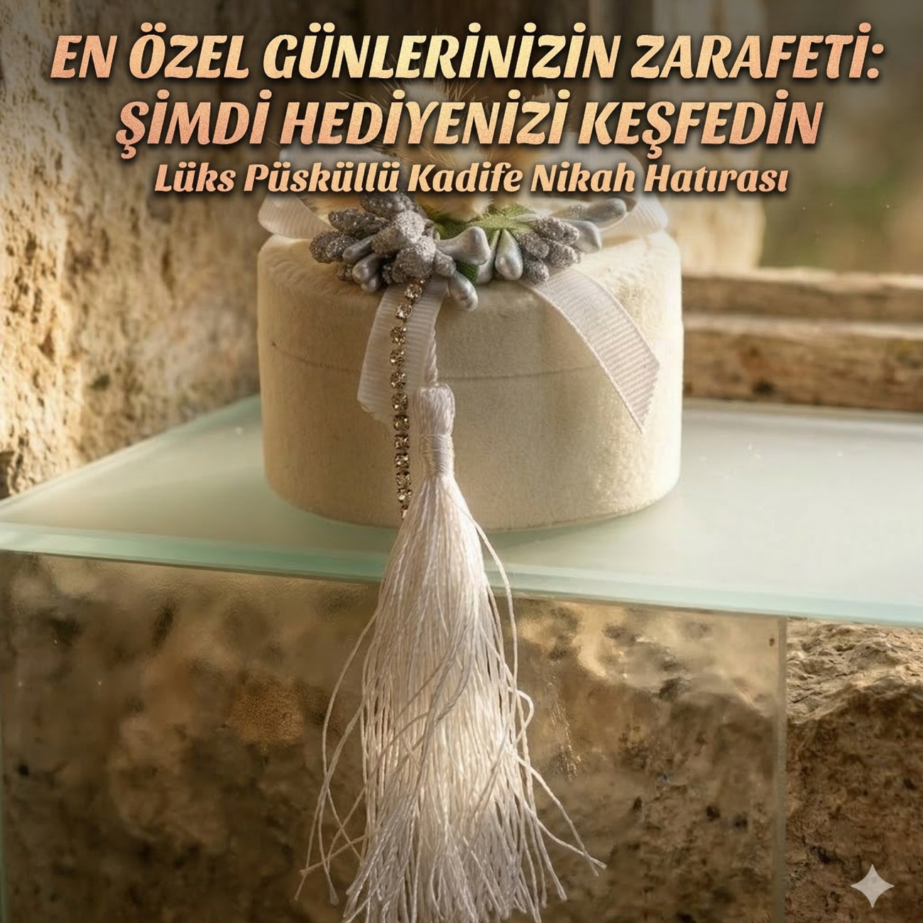 Özel günlerinizin zarafetini simgeleyen bu lüks nikah şekeri, estetik ve kaliteyi bir arada sunuyor. Yumuşak dokulu kadife kutu üzerine özenle yerleştirilen kurutulmuş doğal lagurus çiçekleri, bohem bir hava katarken; kristal taşlı detaylar ve dökümlü beyaz püskül tasarımı göz alıcı bir şıklık yaratır.