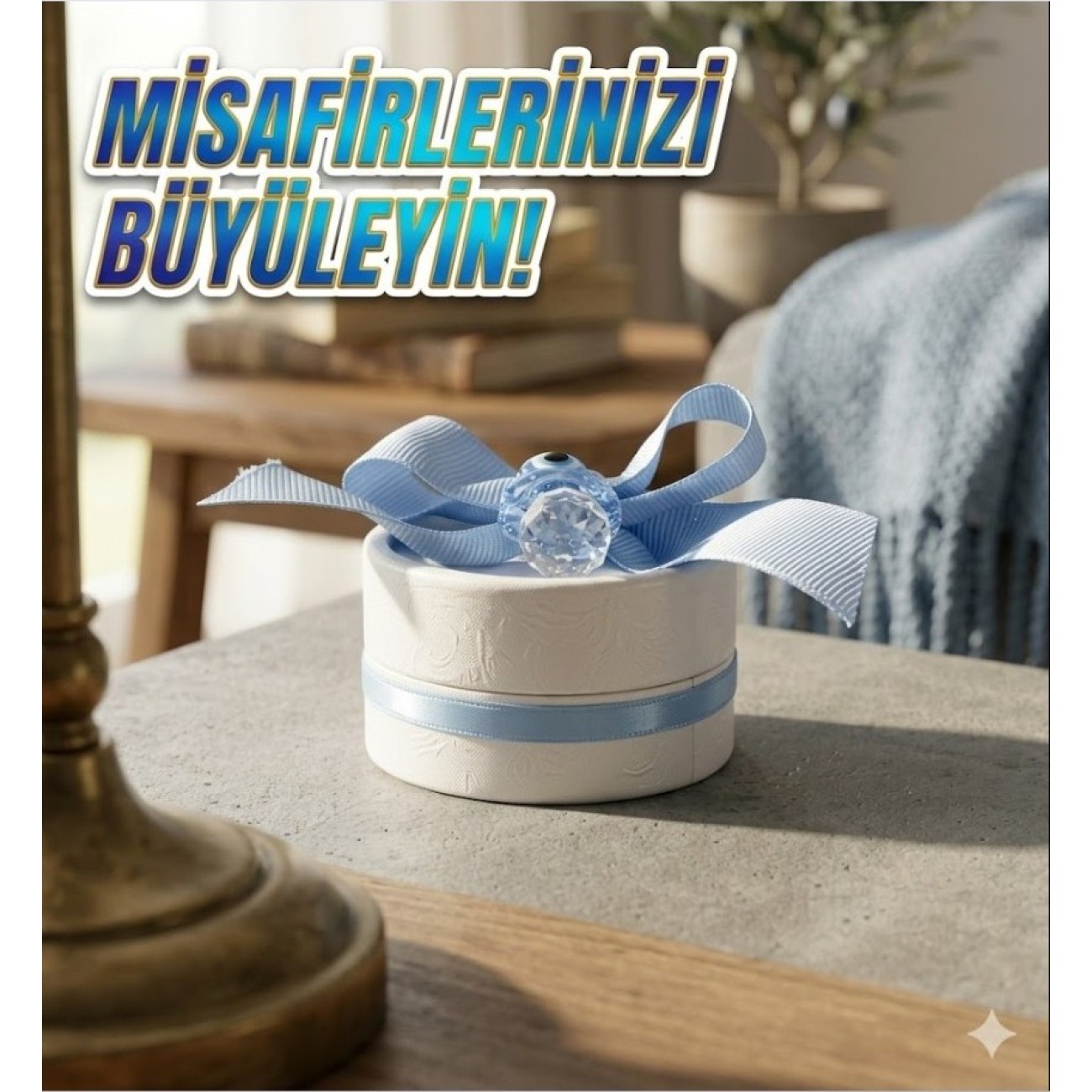 Tasarım: Dokulu beyaz yuvarlak kutu, saten mavi şerit ve kaliteli grogren kurdele süslemesi.