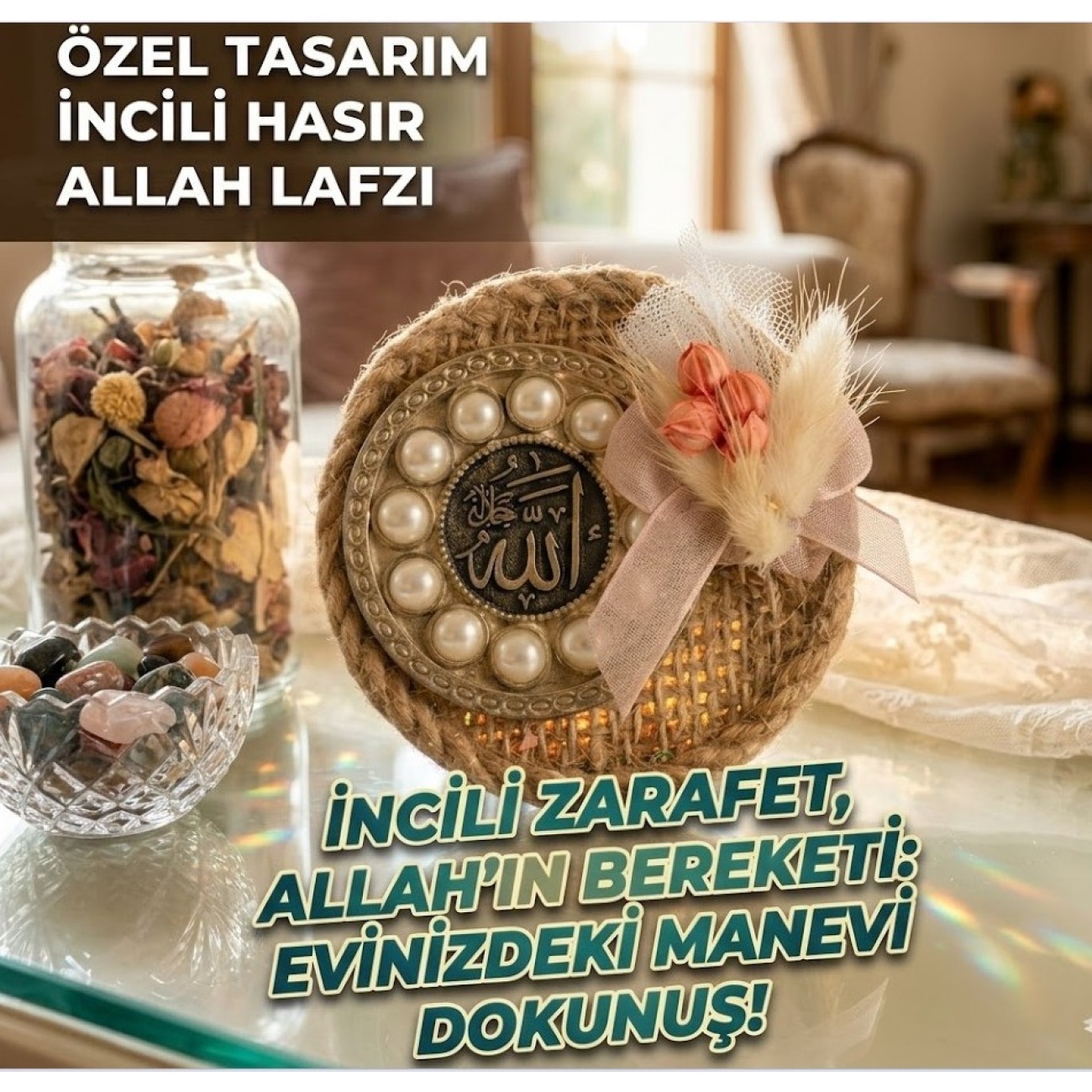 Zarafeti ve maneviyatı bir araya getiren bu özel tasarım incili hasır Allah lafzı, ev dekorasyonunuzda fark yaratmak için tasarlandı. Doğal jüt (hasır) dokusu üzerine titizlikle işlenen inci detayları, geleneksel hat sanatını modern bir estetikle buluşturuyor. Ürün, hem masaüstü aksesuarı hem de şık bir dekoratif İslami hediyelik olarak kullanılabilir. Özellikle yeni ev hediyesi, Mevlüt cemiyetleri veya dini bayramlar için benzersiz bir alternatiftir.