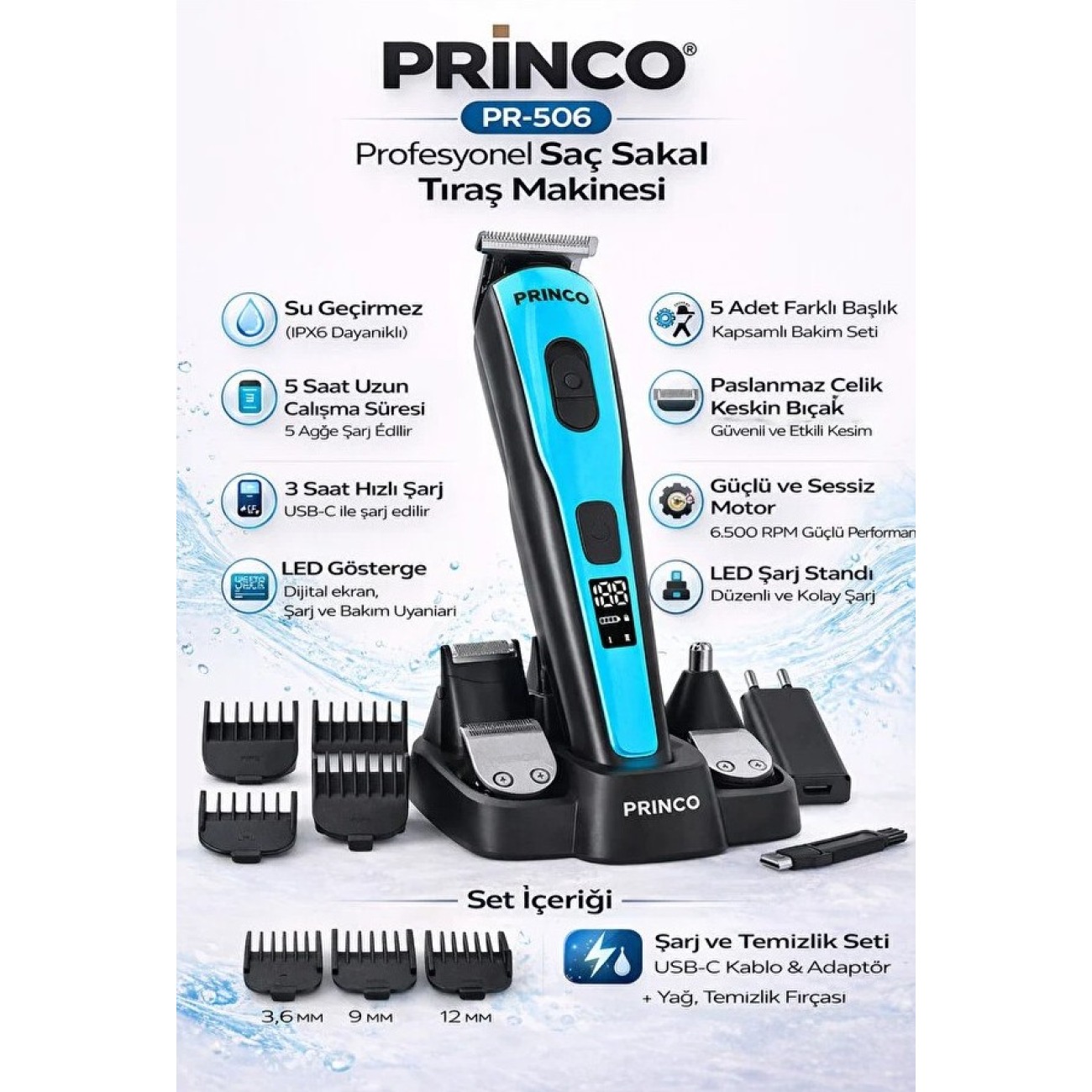 Princo PR-506 Profesyonel Su Geçirmez Şarjlı Saç Sakal Vücut Tıraş Makinesi Seti