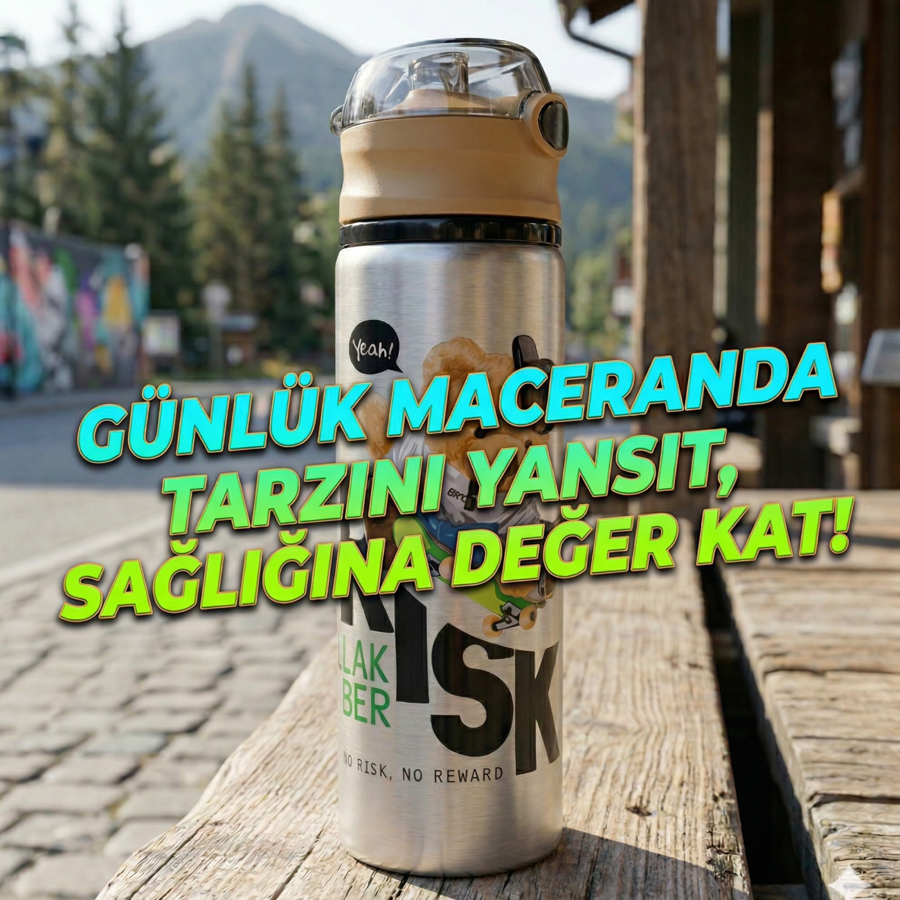 Risk Bear Paslanmaz Çelik Matara ile günlük su tüketiminizi eğlenceli ve sağlıklı bir hale getirin. Üzerindeki ikonik kaykaycı ayı figürü ve "No Risk, No Reward" mottosuyla dikkat çeken bu ürün, hem çocuklar hem de tarz sahibi yetişkinler için mükemmel bir seçimdir. Yüksek kaliteli paslanmaz çelik gövdesi sayesinde içeceklerinizin tadını bozmaz ve uzun süreli kullanım sunar.