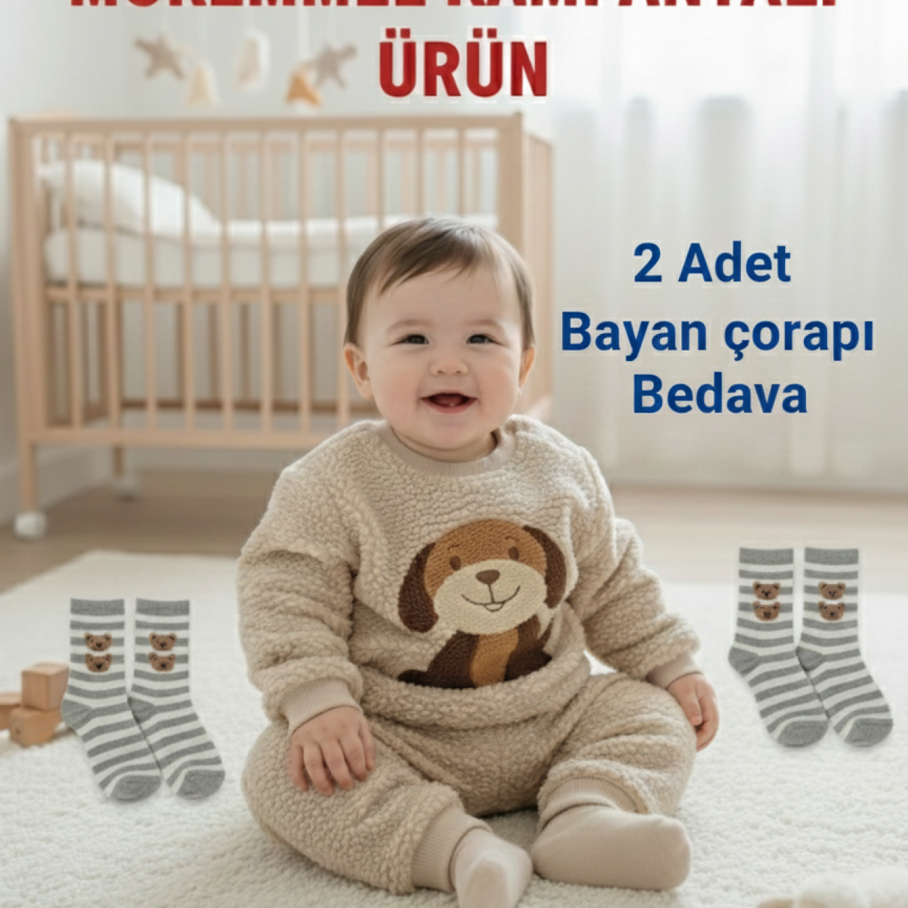 Bebeğinizin konforu ve şıklığı için tasarlanan bu sevimli köpek figürlü bebek takımı, soğuk kış günlerinin vazgeçilmezi olacak. Yüksek kaliteli sherpa peluş kumaşı sayesinde bebeğinizin cildini tahriş etmez, nefes alan yapısıyla terletmeden sıcacık tutar.