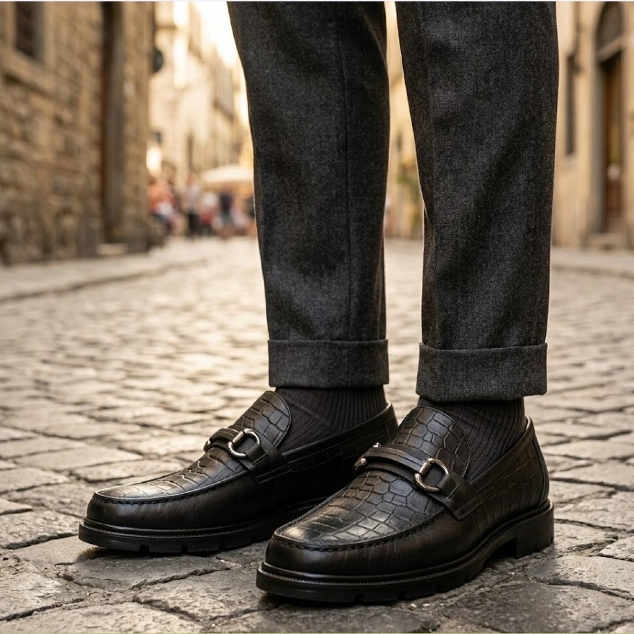 Modern erkeğin gardırobunda fark yaratan Siyah Kroko Loafer, zarafeti cesur bir dokuyla birleştiriyor. Birinci sınıf dana derisi üzerine işlenen yüksek kaliteli timsah baskısı, ayakkabıya derinlik ve karakter katarken; üzerindeki metal aksesuar detayı (bit detayı) İtalyan stilini yansıtır. At Tokalı Ayakkabı kategorisinin en seçkin örneklerinden biri olan bu model, özel günlerden günlük ofis şıklığına kadar geniş bir kullanım alanı sunar.