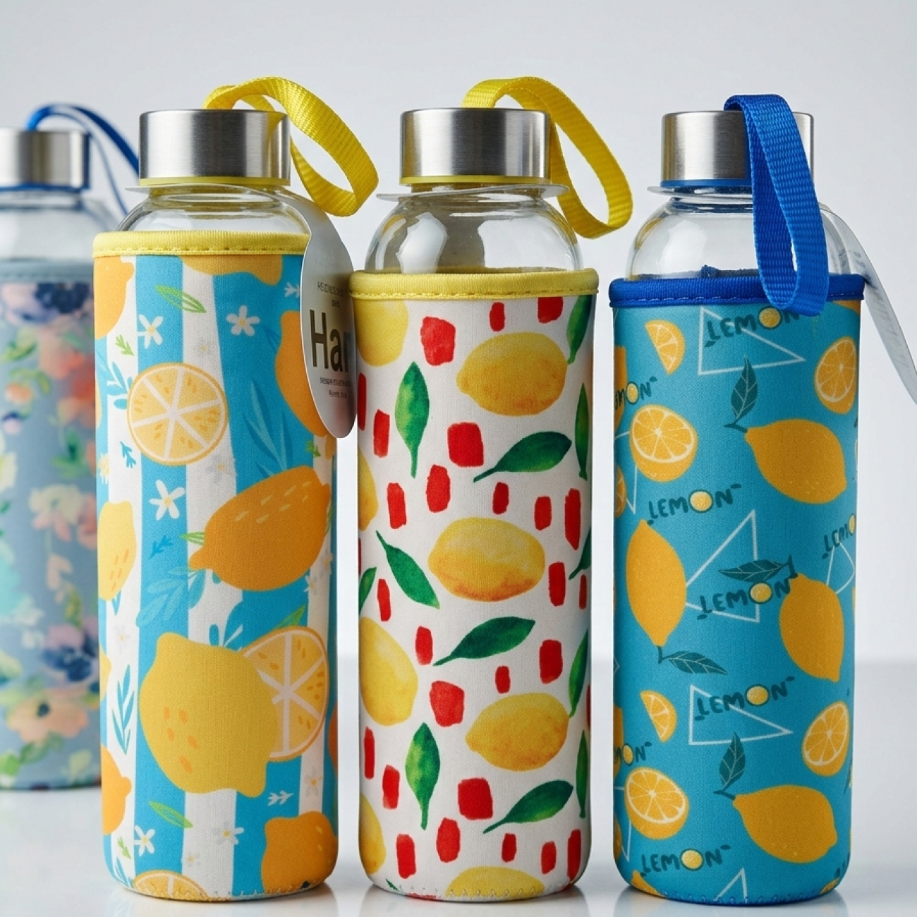 Tohana H2087557 Karışık Desenli 500ml Kılıflı Cam Matara Su Şişesi