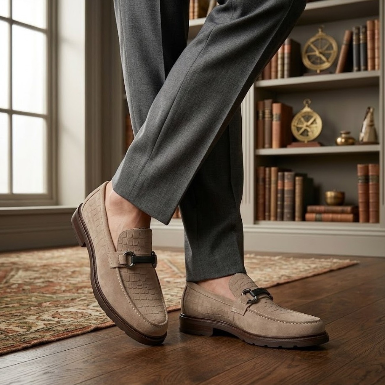 Gündelik şıklığı ve lüksü bir araya getiren vizon krokodil baskılı süet bitli loafer, ayakkabı koleksiyonunuzun en dikkat çekici parçası olmaya aday. Üstün kaliteli süet deri üzerine uygulanan hassas kroko deseni, geleneksel loafer tasarımına modern bir derinlik katıyor. Özel olarak tasarlanan koyu renkli bit (tokalı) detayı, vizon rengin soft dokusuyla mükemmel bir kontrast oluşturarak sofistike bir görünüm sunar.