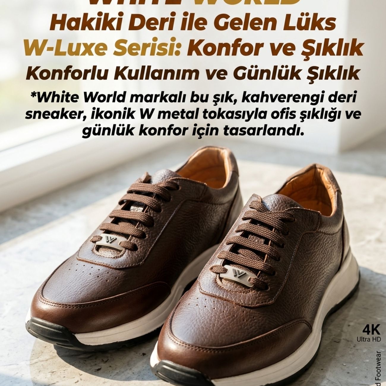 Ayakkabının bağcık bölümünde yer alan ikonik "W" metal toka detayı, White World markasının kalitesini ve özgün tasarım anlayışını temsil eder. Hem jean pantolonlarla hem de kumaş pantolonlarla kusursuz bir uyum yakalayan bu kahverengi sneaker, zamansız rengiyle her mevsime hitap eder. El işçiliği detayları ve estetik dikiş hatları, estetiği ve fonksiyonelliği bir arada arayanlar için titizlikle işlenmiştir. Şıklığınızdan ödün vermeden, adımlarınızda White World farkını hissedin.